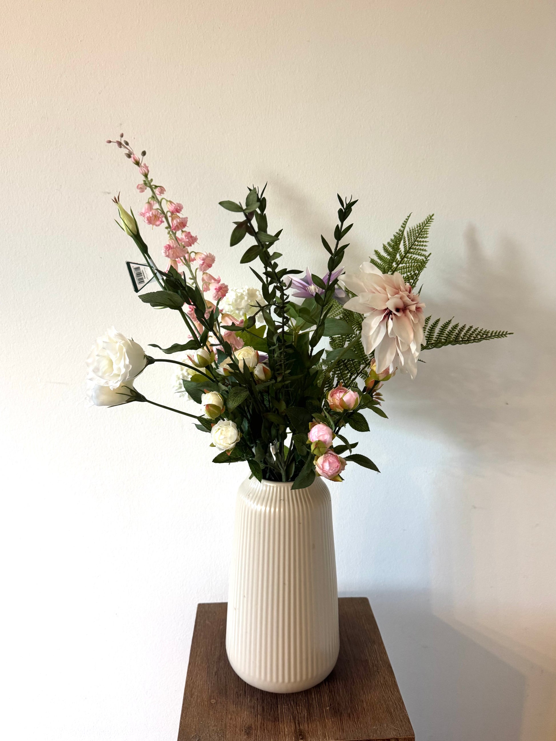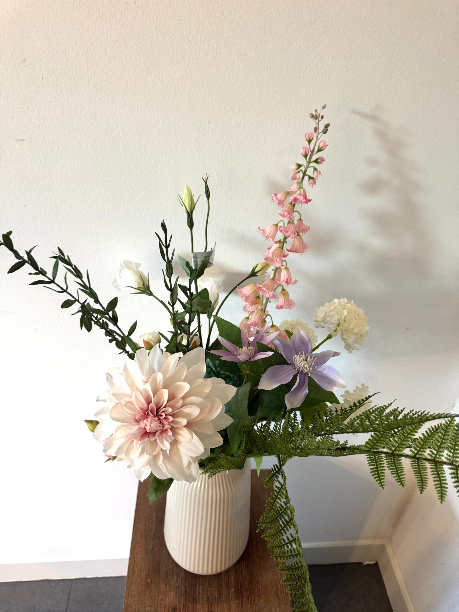 Een romantisch boeket vol zachte tinten: pastelroze rozenknopjes, witte pioenrozen en een lichtroze dahlia vormen samen een sierlijk geheel. De subtiele bloesemtak en het luchtige groen zorgen voor een natuurlijke charme. Ideaal voor een serene sfeer in elke kamer.