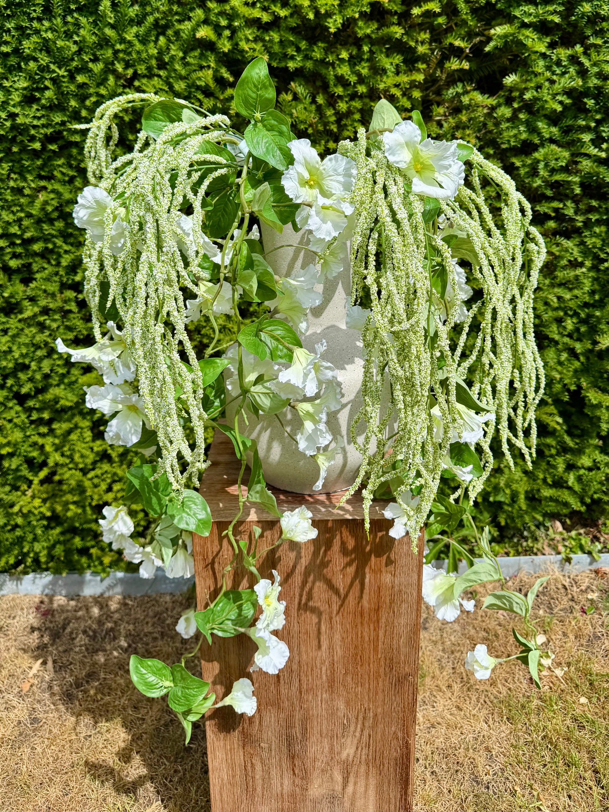 Een subtiele mix van elegantie en speelsheid. Combineert het verfijnde van hangende wilgenkatjes met het luchtige karakter van witte petunia’s. Heldergroen blad en frisse bloemen vangen het gevoel van een zonnige voorjaarsmiddag, licht, helder en levendig.