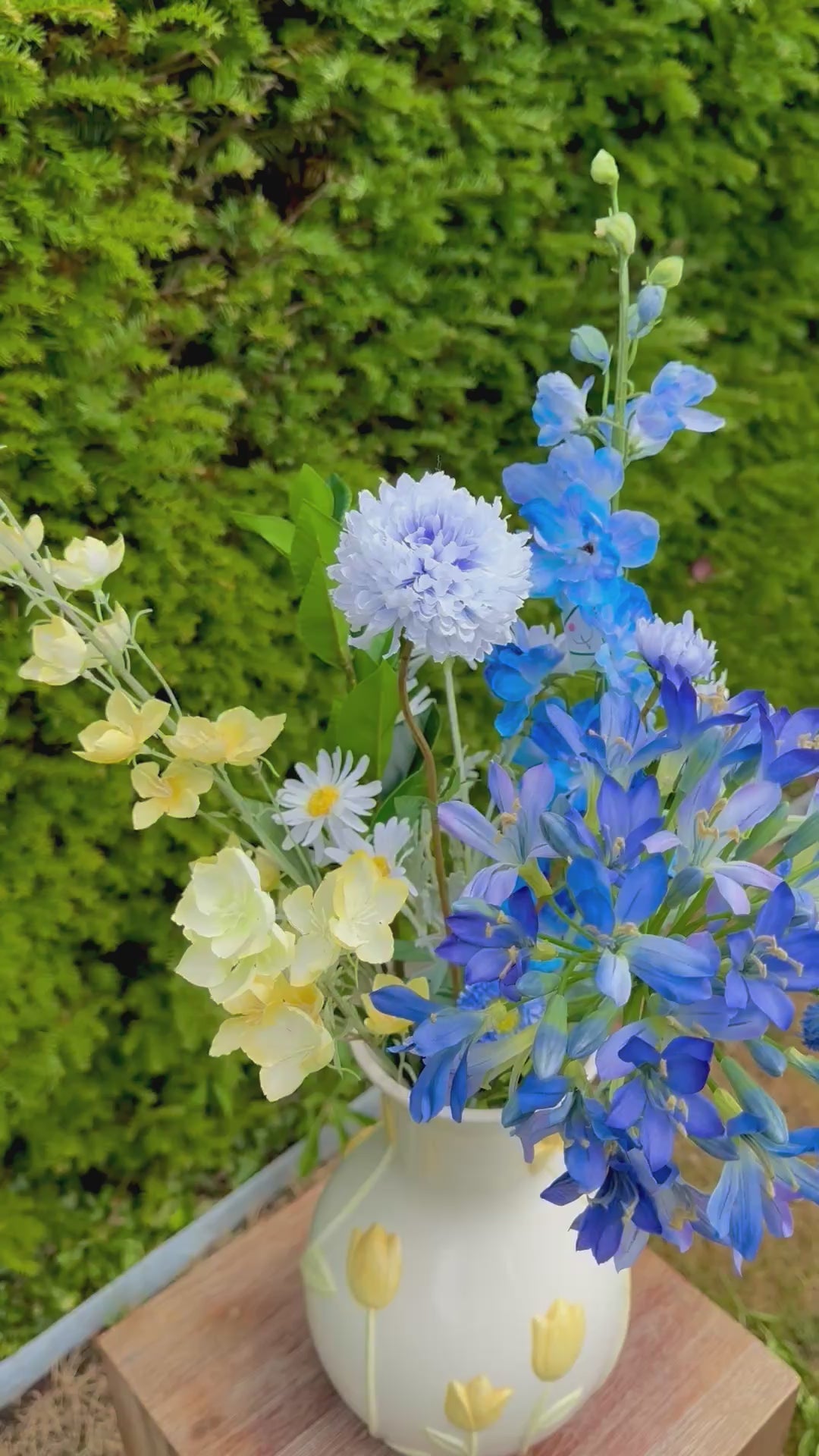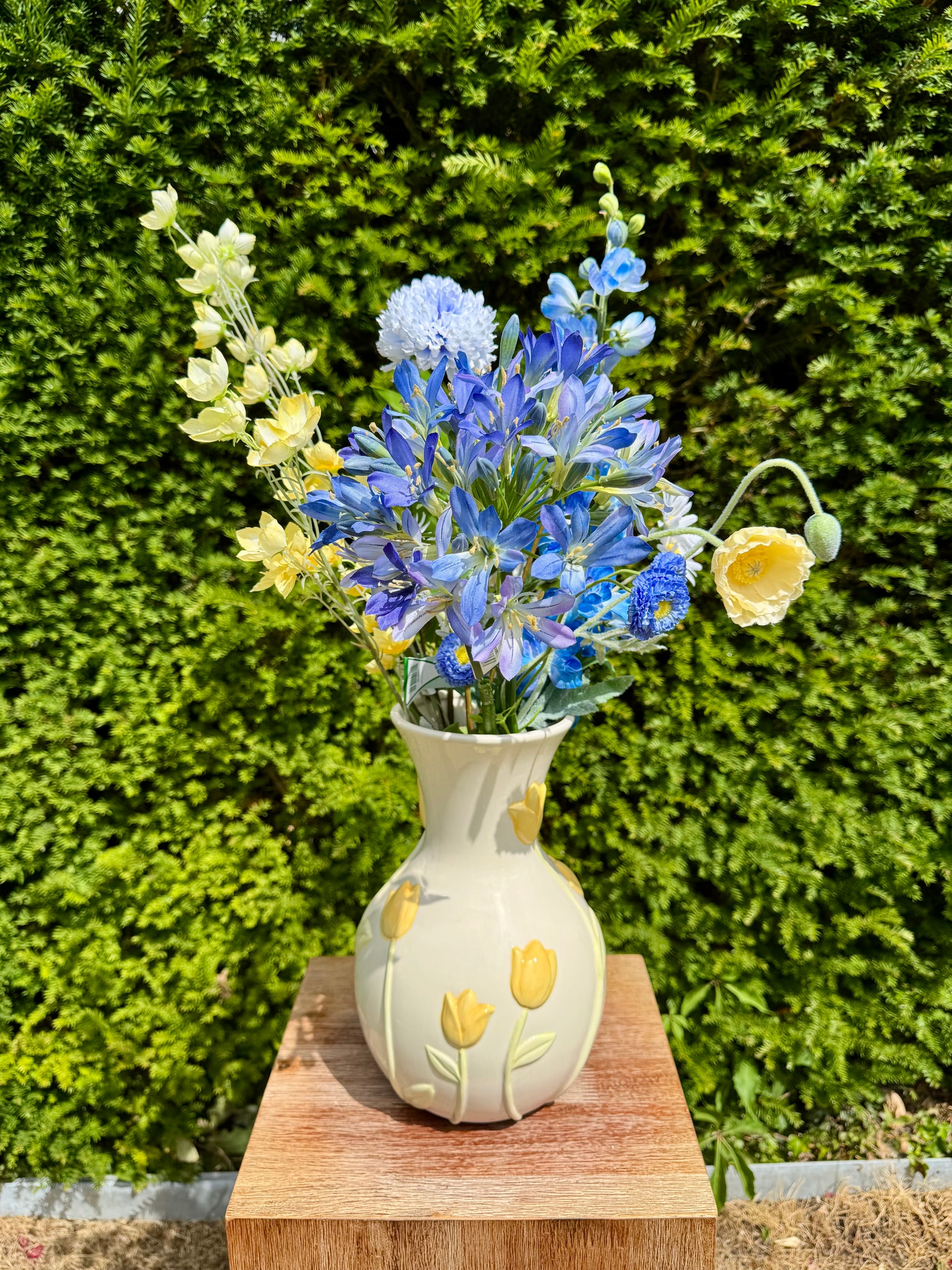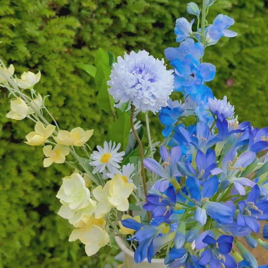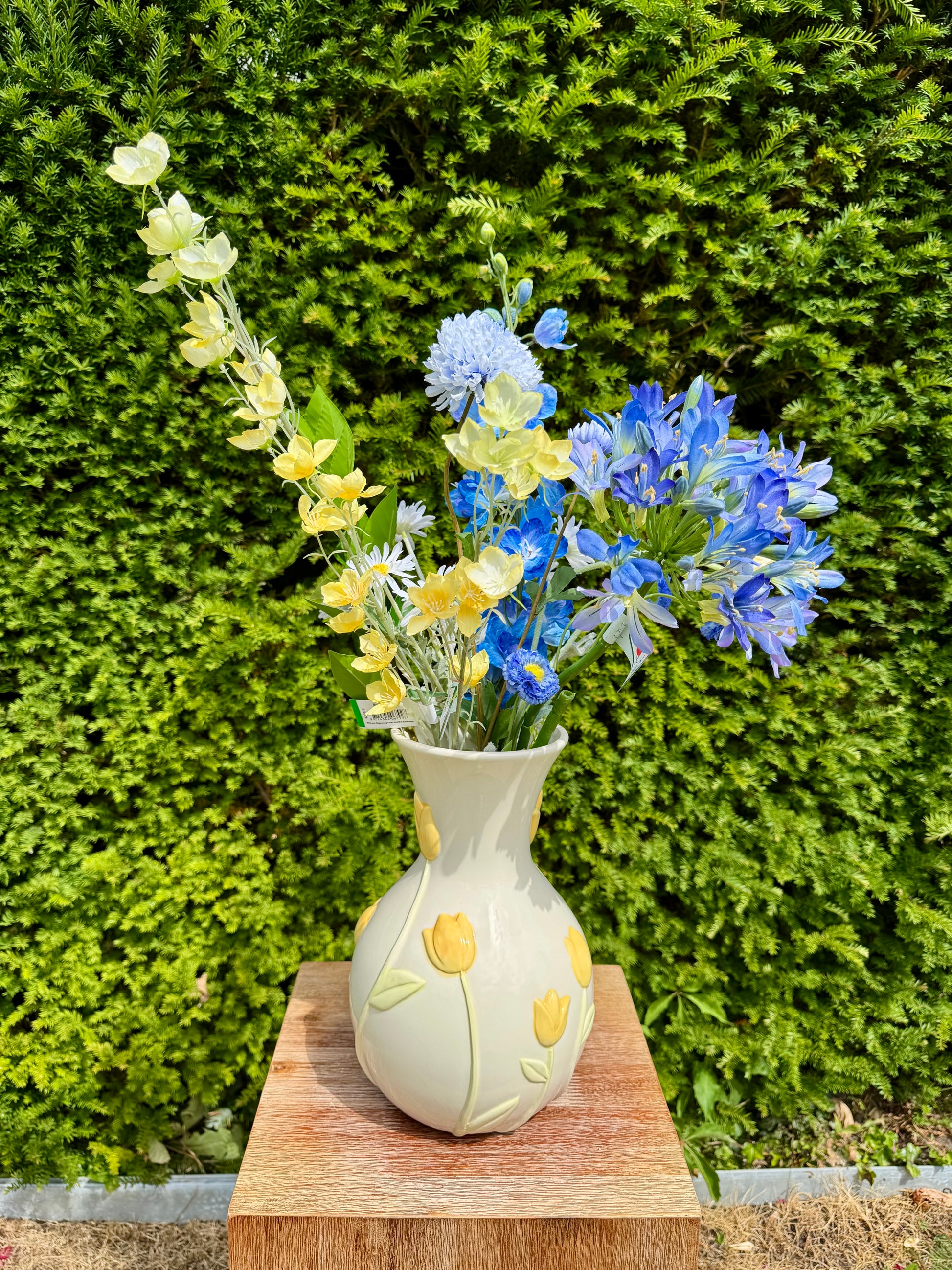 Ochtendbries doet denken aan een frisse ochtendwandeling in een bloemenveld. Heldere blauwtinten, zachte botergeel en fris wit zorgen samen voor een rustgevende, opgewekte uitstraling. De delphinium, madelief en lathyrus vangen het eerste licht van de dag in een vaas.