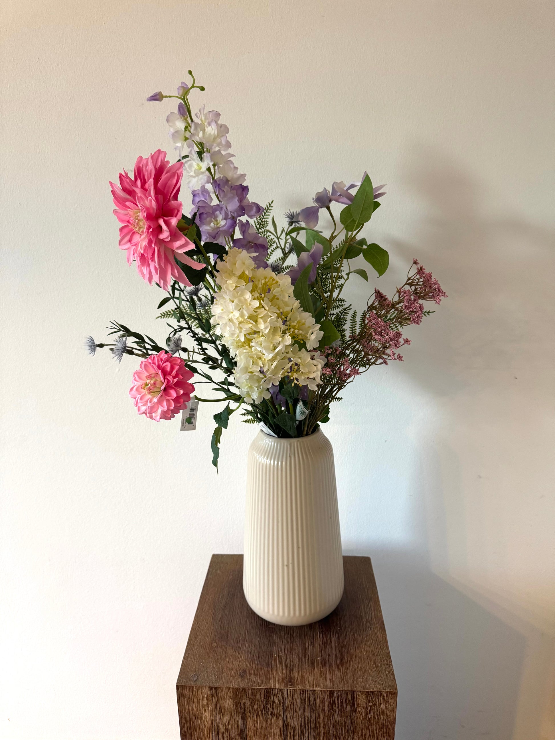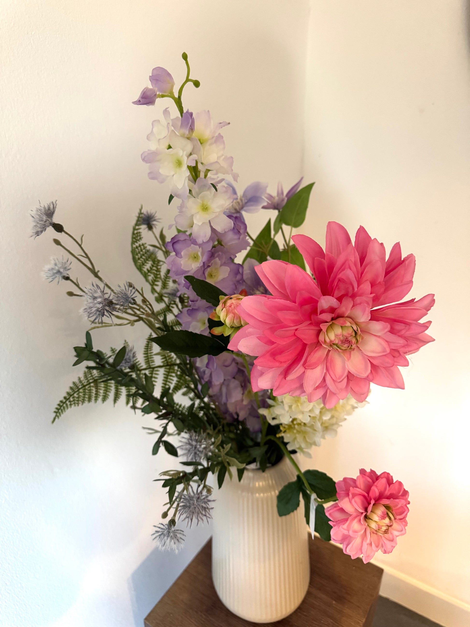 Een charmant en speels boeket vol zachte pasteltinten en romantische accenten. De combinatie van roze dahlia’s, paarse lathyrus en roomwitte hortensia’s brengt een frisse, lenteachtige sfeer in huis. Perfect voor wie houdt van kleur en elegantie met een vleugje romantiek.