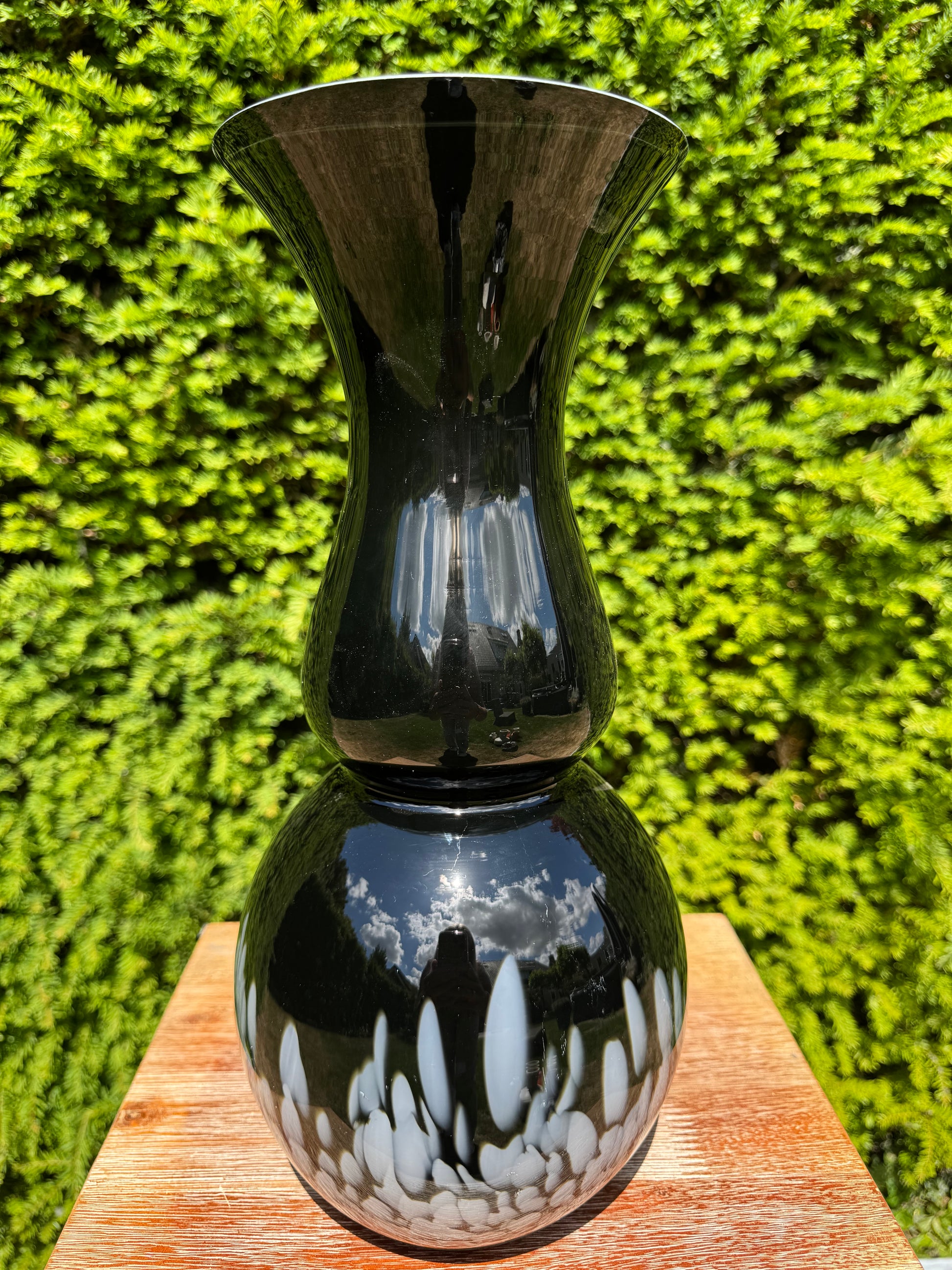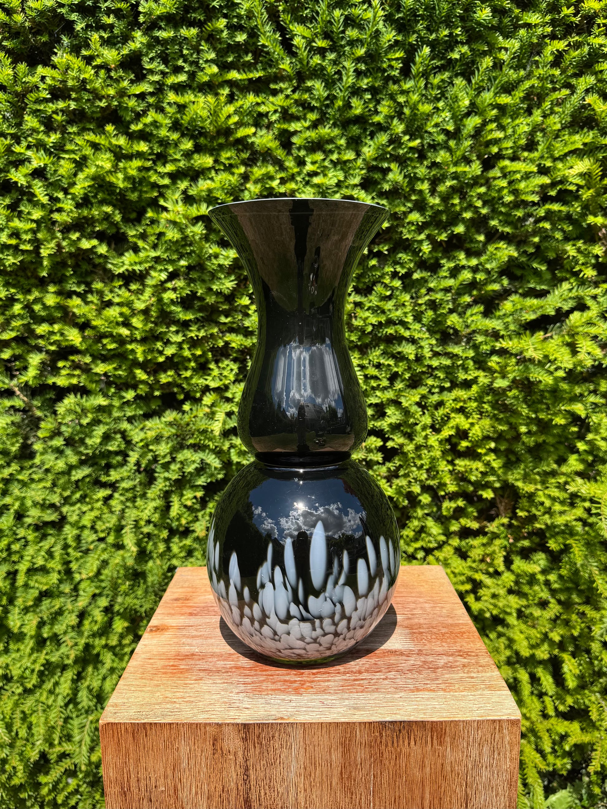 De unieke vorm, een elegante smalle hals met een bolvormige basis, in combinatie met het glanzend zwarte glas en het witte, druppelachtige patroon aan de onderzijde maakt deze vaas een opvallend object in elke ruimte. Door het ambachtelijke productieproces is elke vaas uniek.