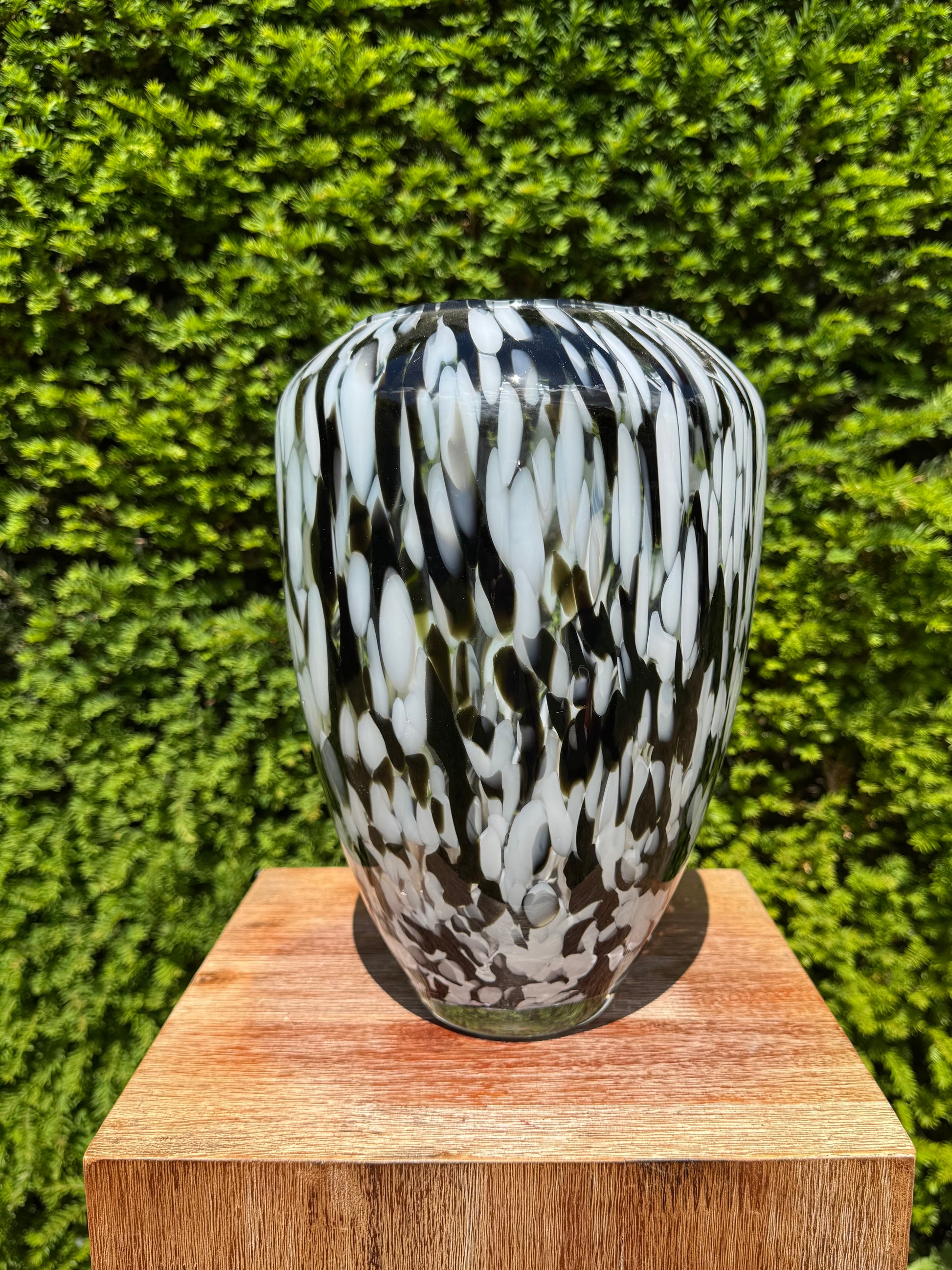 Het spel van witte, zwarte en grijze glasdruppels creëert een dynamisch en modern effect, waardoor deze vaas een echte eyecatcher is in elke woonruimte. Dankzij het ambachtelijke productieproces is elk exemplaar uniek in patroon en uitstraling.