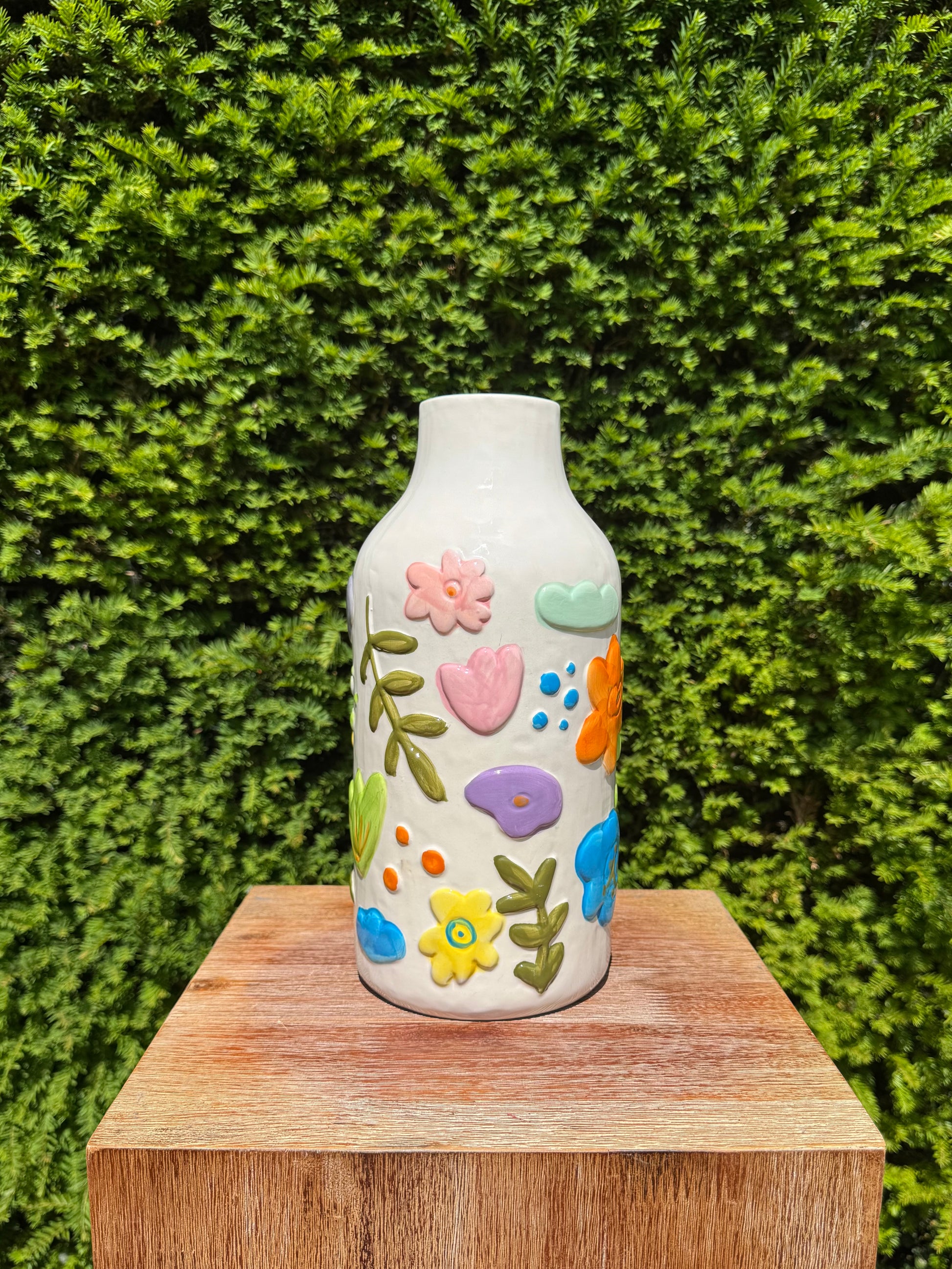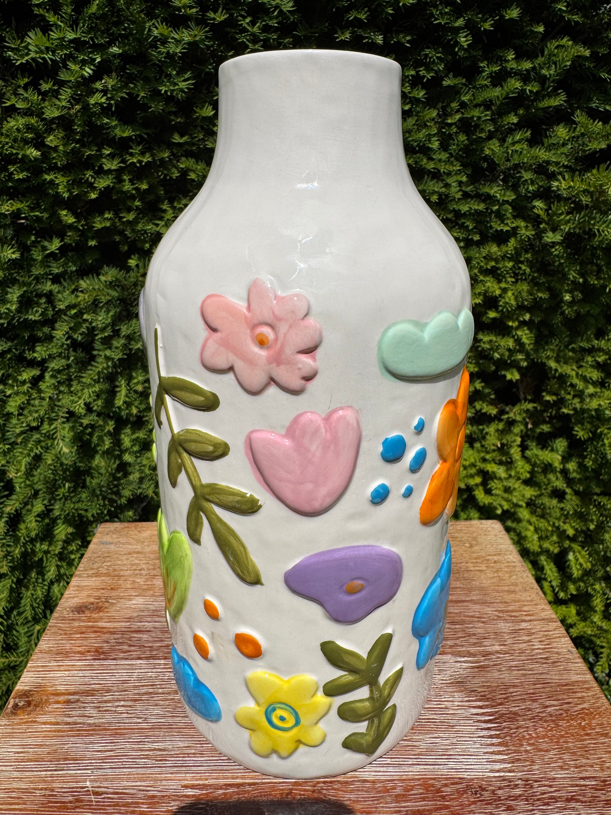 De witte basis van de vaas is rijkelijk versierd met kleurige, reliëfachtige bloemen, hartjes en blaadjes in levendige tinten zoals oranje, roze, blauw en groen. Elk detail is met de hand aangebracht, waardoor geen twee exemplaren exact hetzelfde zijn.