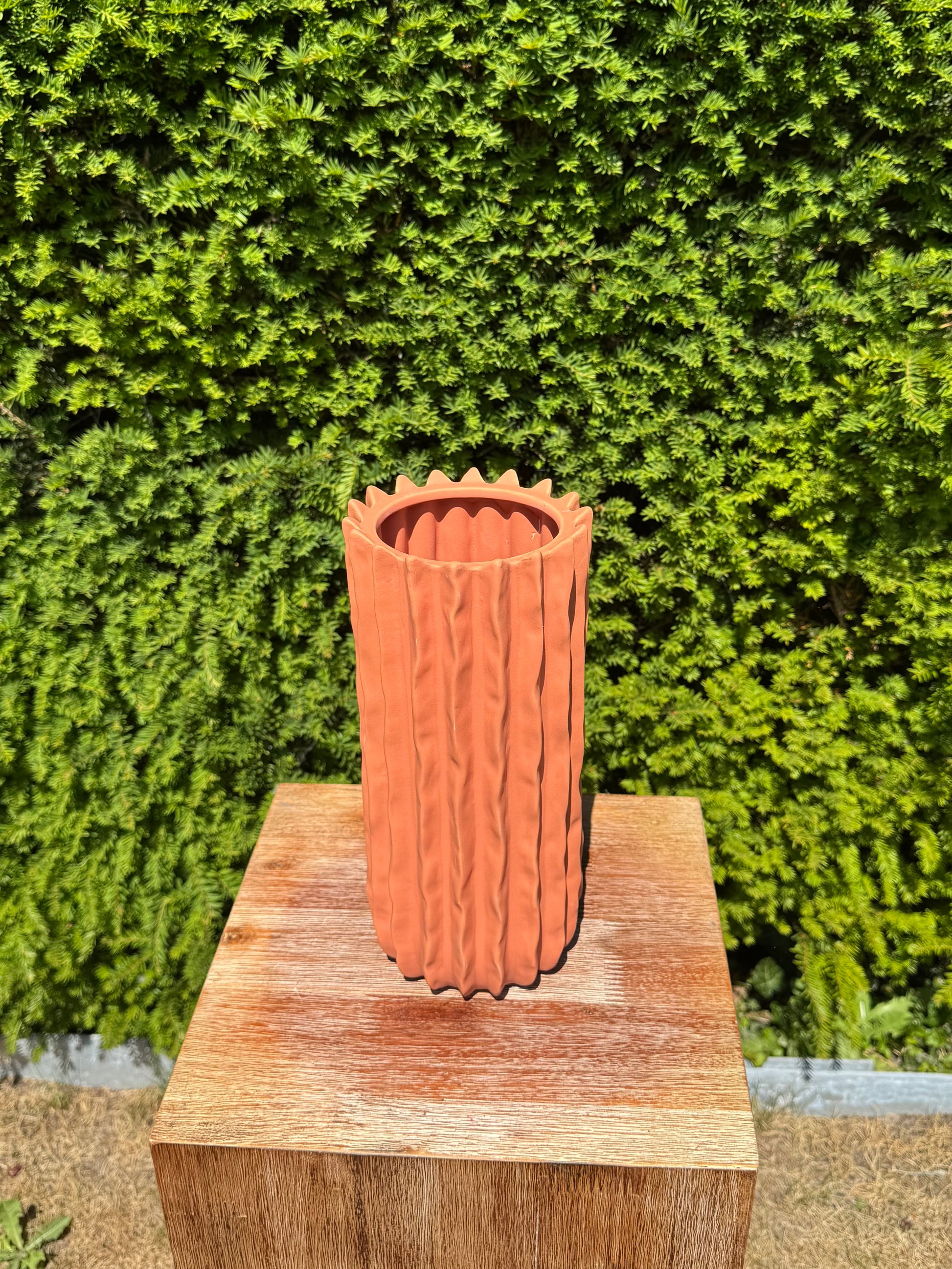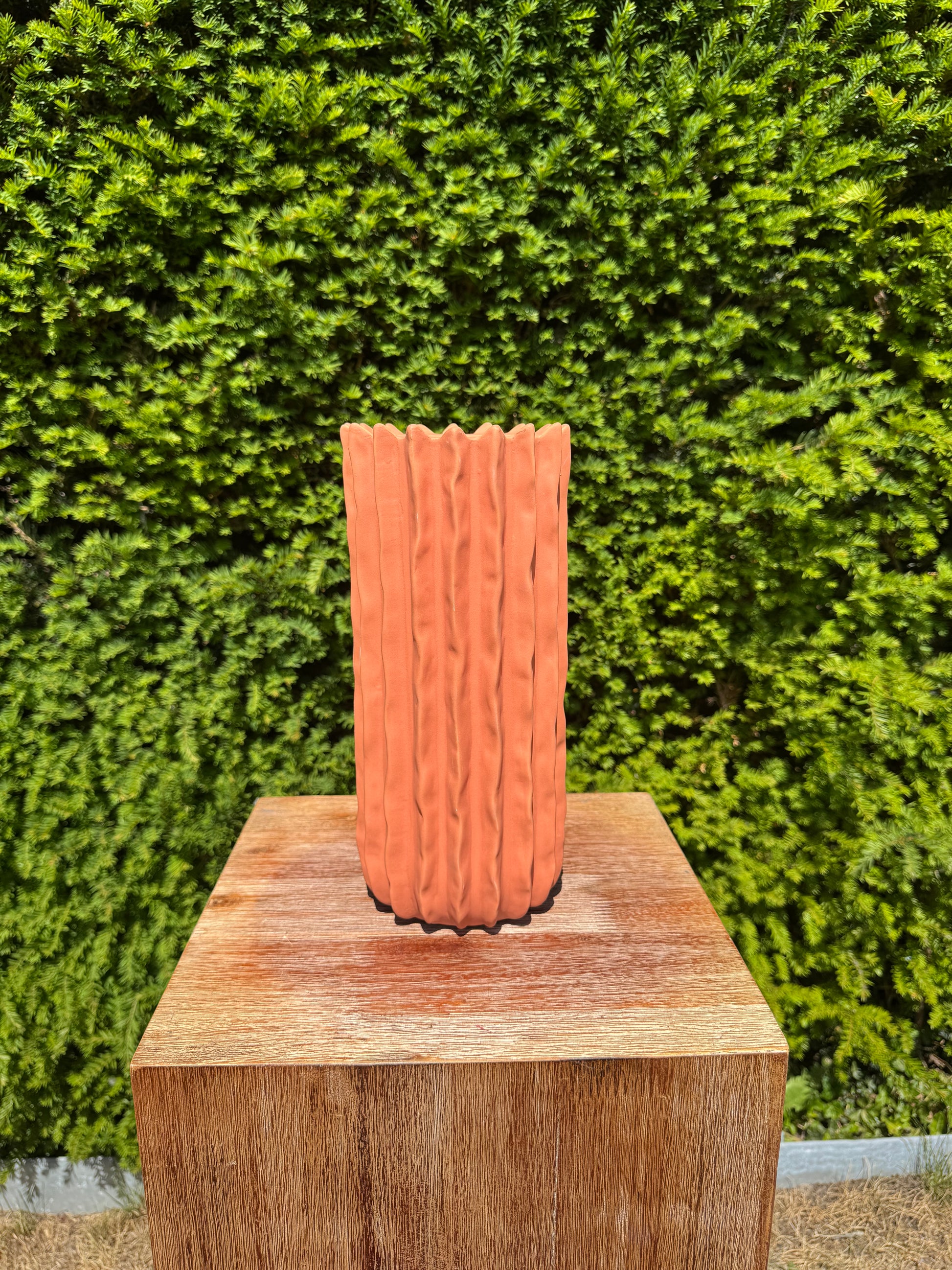 De terracotta kleur en grillige, verticale ribbelstructuur geven de vaas een aardse, bijna rotsachtige uitstraling. De matte afwerking benadrukt het natuurlijke, ongepolijste karakter en maakt van deze vaas een uniek stuk dat moeiteloos de aandacht trekt, zelfs zonder bloemen.