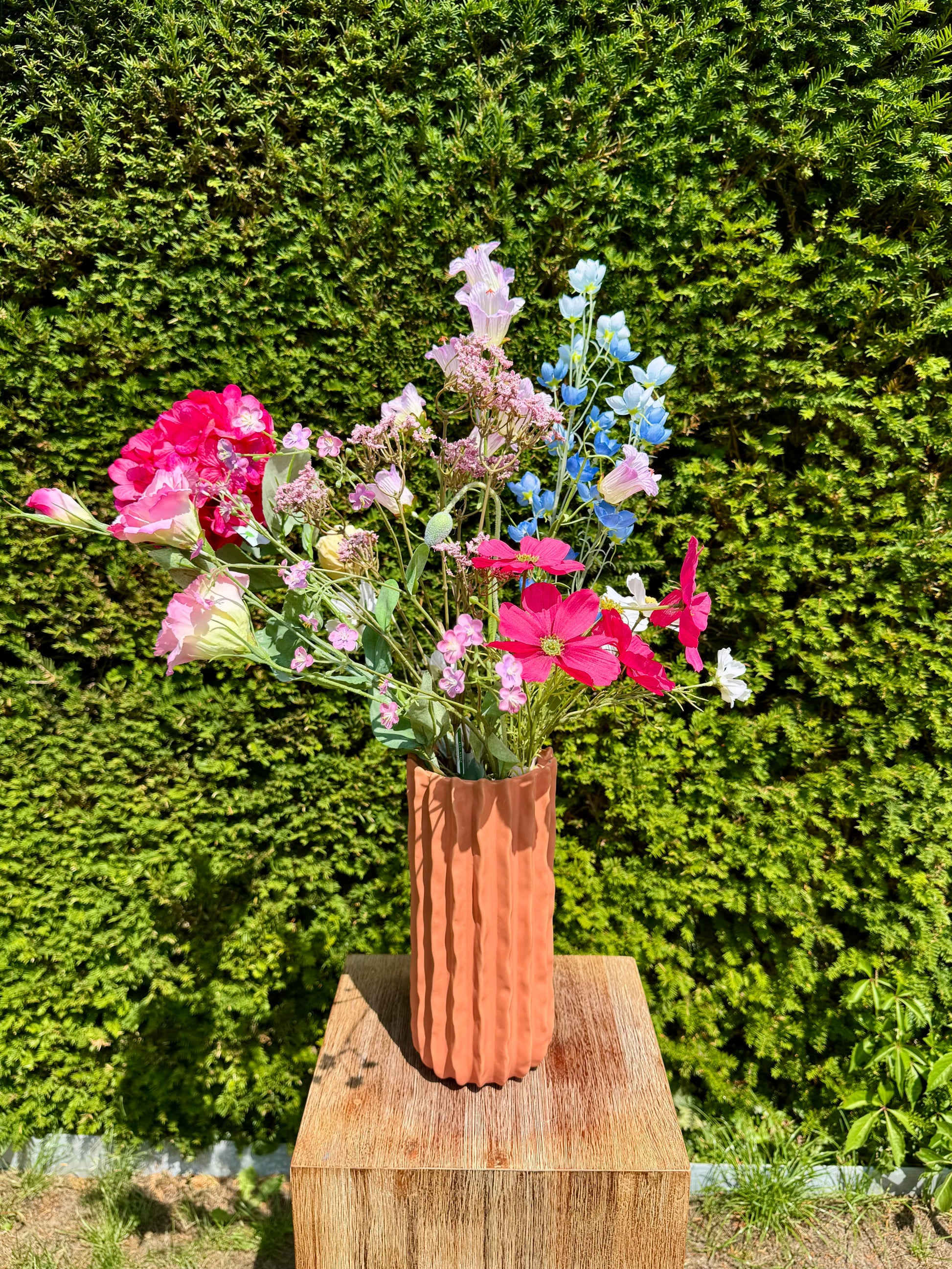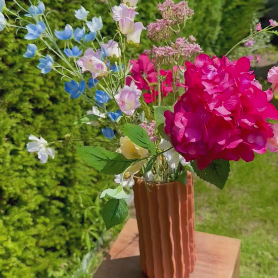 Veldlicht heeft de charme van een zomerse bloemenweide. Het boeket voelt luchtig en spontaan, alsof je de bloemen zelf geplukt hebt. Met de opvallende roze bloem als warme blikvanger geeft dit boeket een speels en vrolijk accent in elk interieur.